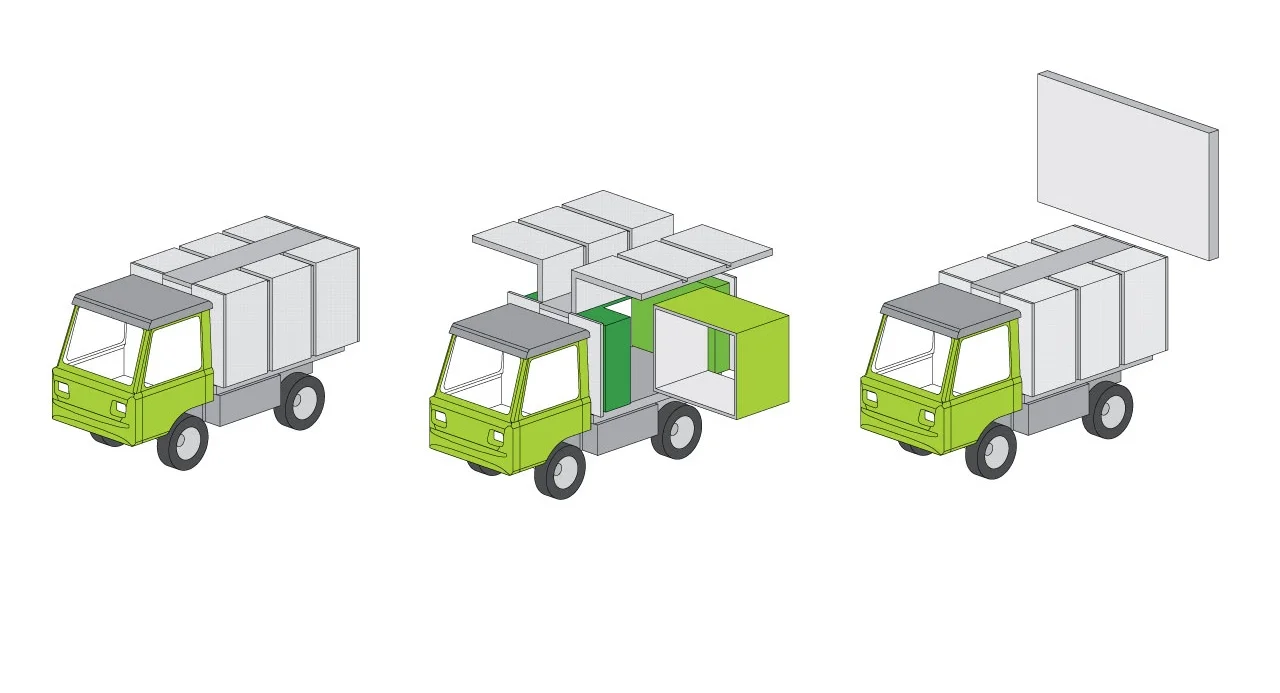 Outside the OMCA, the Rover acts as an extension of the museum, bringing the museum to all the people of Oakland and bringing people to the museum. Floating through city streets, its translucent shell illuminated from within, the Rover becomes a glowing emblem of the museum. When the Rover lands—at a community art event for example—its gull-wing doors open and the Rover begins its transformation from vehicle to architecture. Inside is a system of interchangeable cartridges attached to sliding tracks. Cantilevered gallery spaces are created as the cartridges are extended, enabling the Rover to support a wide array of activities.